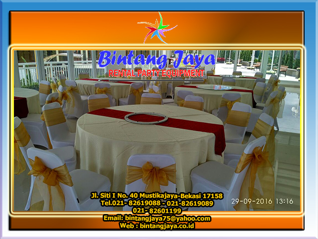 Menyewakan kursi untuk seluruh wilayah JABODETABEK lengkap dengan sarung kursinya yang berkualitas standar hotel.Jadi jangan ragu untuk sewa kursi percayakan kepada kami.Sewa sekarang hubungi 021-82601199