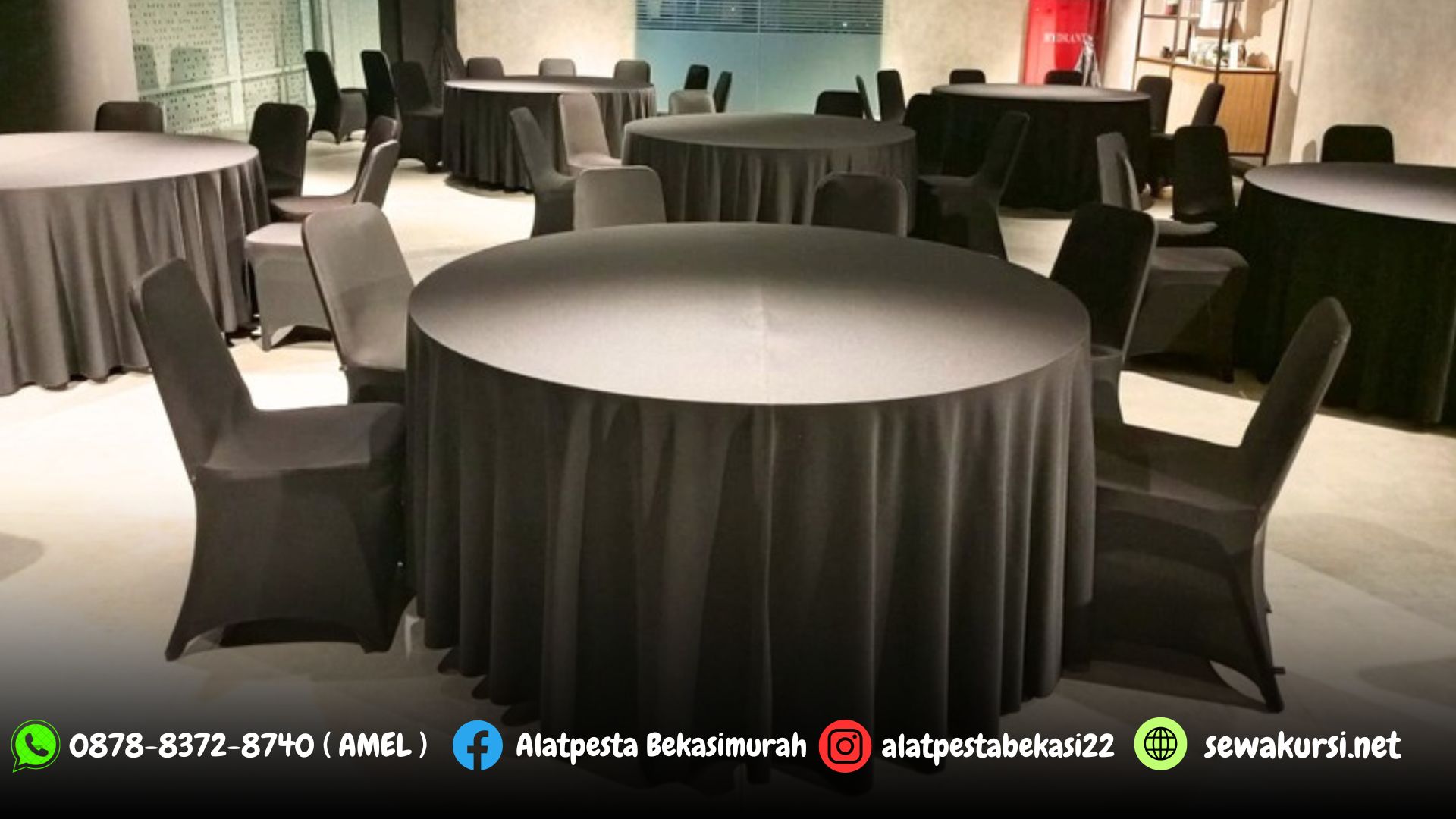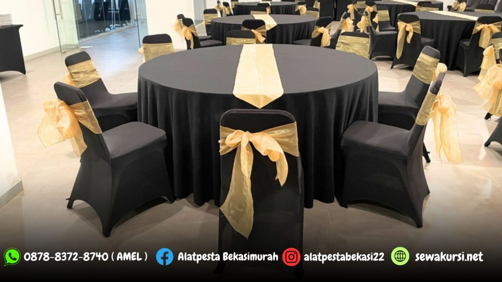 Meja bulat yang kamu sewakan tersedia dengan beberapa pilihan ukuran mulai dari 75cm, 90cm, 120cm, 160cm, 180cm dan 220cm. Anda bisa aplikasikan dengan cover skirting dan tebar yang tersedia dengan banyak pilihan warna. Untuk pemesanan silahkan datang langsung kekantor resmi kami yang beralamat >>>