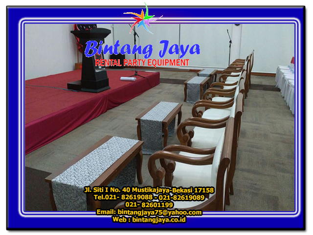 Menyewakan kursi untuk berbagai acara anda.Salah satu kursi yang kami sewakan adalah kursi vip kayu.Kursi vip kayu ini buatan kota ukir jepara dengan kayu jati asli , sehingga kokoh,garapan rapih,mengkilat dan berkesan mewah.