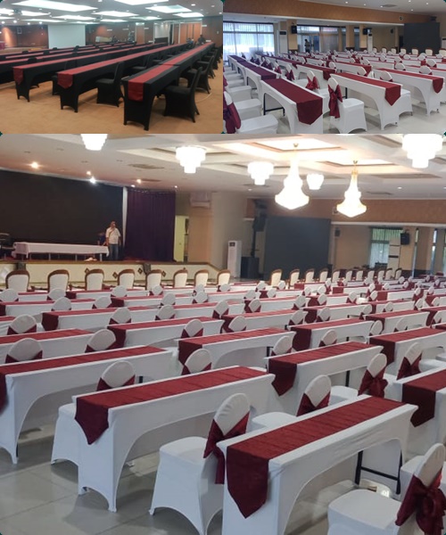 Untuk pemasangan cover sendiri warnanya bisa disesuaikan sesuai kebutuhan event anda dilengkapi runner di atas cover meja ibm ketat.