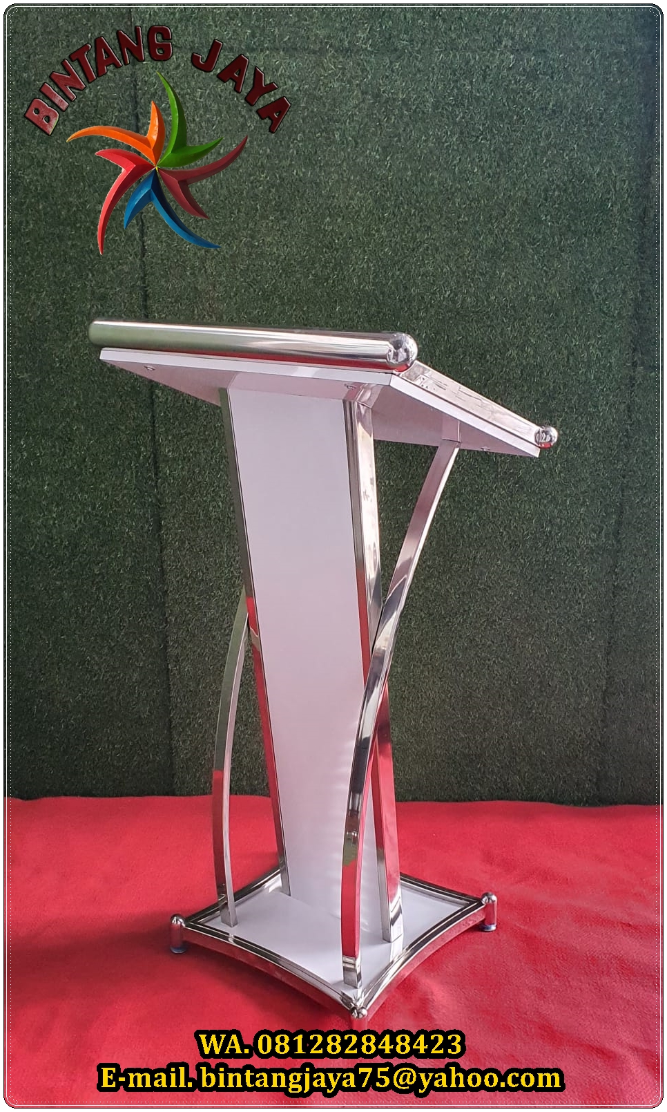 Untuk podium kami sediakan podium VIP (podium kayu ukir), podium acrylic, podium sirine, podium rangka stainless dan masih banyak lainnya. Bagi anda yang mau sewa podium kami, anda bisa pilih sendiri dan melihat-lihat secara langsung alat pesta lengkap lainnya. Silahkan kunjungi kantor resmi kami dialamat berikut ini>>>